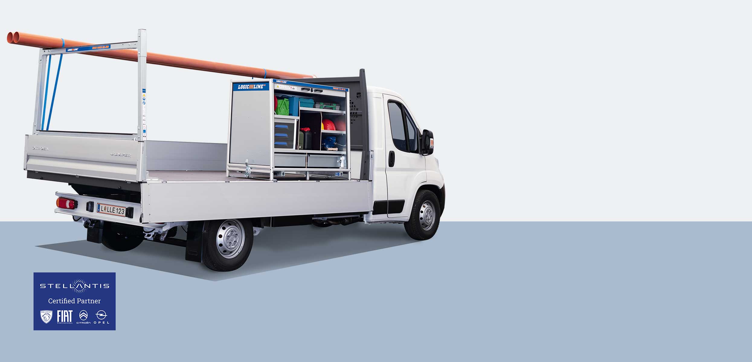 The Citroën Jumper Flatbed Plus is the perfect utility vehicle for the safe transport of tools and equipment, especially for roofers, plumbers and carpenters. This model was developed through collaboration between Citroën and LogicLine. The Flatbed Plus Solution complements your Citroën Jumper with a transport box on the loading area, an Underslung Toolbox beneath the loading area, and a load carrier at the rear for the horizontal transport of long items. Alongside the equipment solution in the form of the Flatbed Plus Solution from Citroën, the LogicLine range also includes other high-quality accessories with which you can efficiently design your work procedures and ensure the transportation of secured loads.